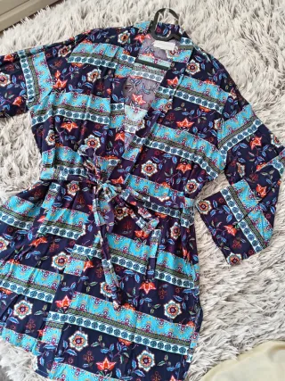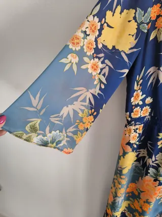 Elegante vestido estilo kimono con un estampado llamativo. - Diseño con mangas cortas. - Cinturón a juego para ajustar la silueta. - Tejido ligero y fluido tipo raso Cintura 40cm Caderas 50 cm Largo 90 cm Sin estrenar