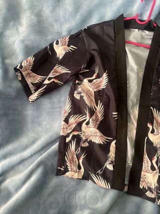 Kimono con un llamativo estampado de grullas en tonos blancos y rosados sobre fondo negro. Su diseño abierto y las mangas amplias le dan un toque elegante y fluido. - Diseño de kimono. - Estampado de grullas. - Mangas amplias.
