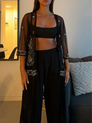 Elegante kimono con un diseño único y detalles brillantes. - Tejido de malla transparente. - Adornos plateados bordados. - Diseño abierto.