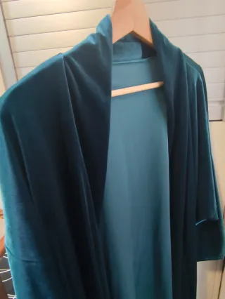 Precioso kimono corto de terciopelo en un llamativo color azul petróleo. Su diseño fluido lo hace muy elegante. - Tejido suave y brillante. - Corte abierto. - Manga larga.