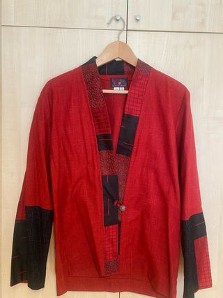 Chaqueta estilo kimono con un diseño único y llamativo. - Combinación de paneles en rojo y negro. - Detalles de estampado geométrico y floral. - Cierre con botón decorativo.