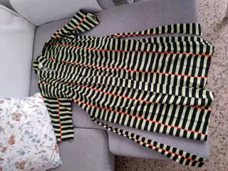 Bata estilo kimono con rayas verticales negras y verdes y detalles en naranja. Talla única, de algodón y lyocell. Materiales naturales.