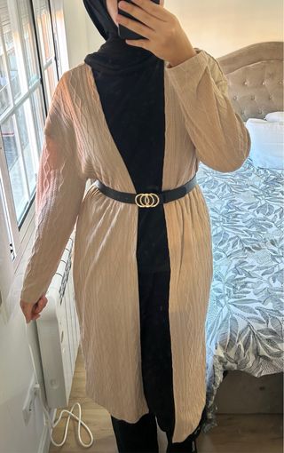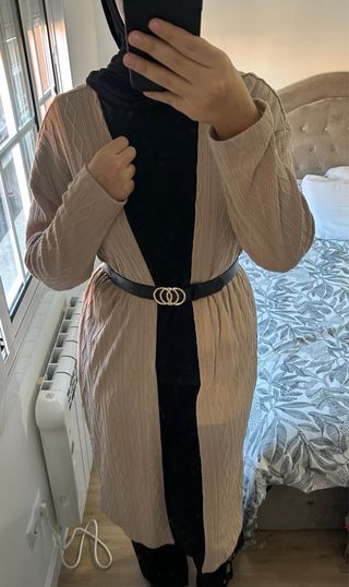 Kimono largo de punto en color beige. - Diseño tejido con textura. - Corte abierto. - Manga larga. El cinturón no viene incluido.