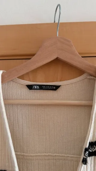 Cárdigan estilo boho de ZARA, confeccionado en tejido de algodón texturizado en tono beige cálido con detalles étnicos en negro y acabado con flecos decorativos. Perfecto para: – noches de verano – looks de playa y viajes – llevar sobre vestidos o jeans – estilos festival / resort ✨ corte relajado ✨ tejido ligero y transpirable ✨ bonito movimiento gracias a los flecos ✨ silueta abierta muy favorecedora Ideal como prenda ligera para entretiempo o verano.
