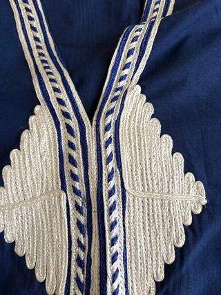 Chilaba larga con un diseño bordado en la parte delantera y en el cuello. - Bordado blanco con detalles en azul. - Diseño de rombos en el pecho y en la parte inferior. - Cuello en V con ribete decorativo. Comprada en Túnez. Sin usar. Se ajusta con unas cintas interiores