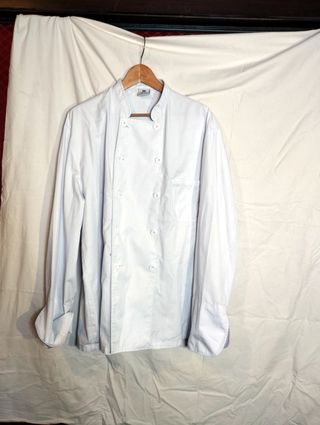 Uniforme de cocinera/o con gorro. La chaqueta es de sarga blanca. El pantalón está acortado, puedo vender solamente la chaqueta y el gorro. Talla XXL