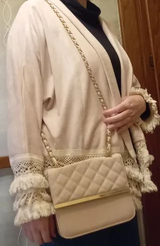 Chaqueta con delanteros desiguales a la espalda terminados en flecos. Color beige claro. Talla S grande. Tiene una pequeña mancha en un delantero que enseño en una foto