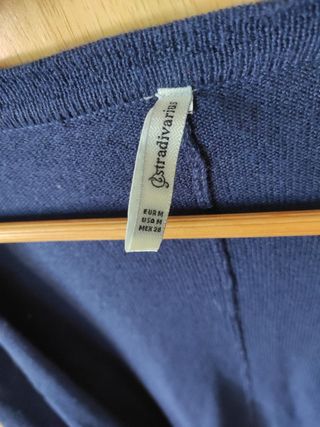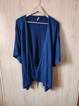 Chaqueta de punto de Stradivarius de la talla M. Aunque puede ser talla única porque solo cierra con un cordón y sirve para todas las tallas. Color azul marino. Tipo kimono. Manga corta. Abierta por delante. Sólo cierra con un cordón. Largo aproximado 76 cm. Muy bien estado. Puesta en una ocasión.