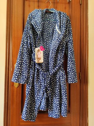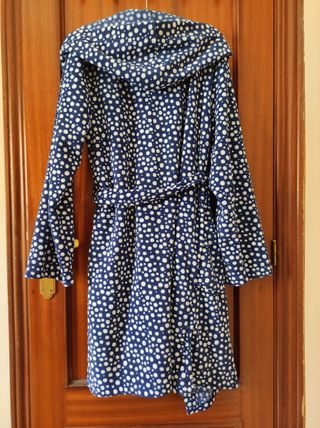 Bata azul de lunares blancos con capucha, sin estrenar, suave y calentita. Comprada en mercería. Talla: L-XL. Material: 100% poliéster.