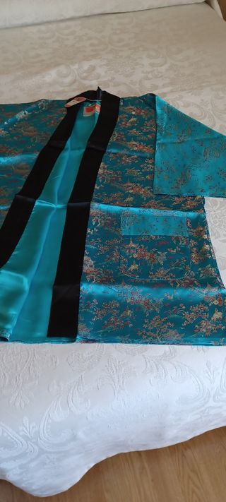 Kimono chino de seda y precioso colorido y forrado de tela lisa como se puede apreciar en las fotos. Sin estrenar. Mide 0,86 de largo y tiene dos bolsillos.