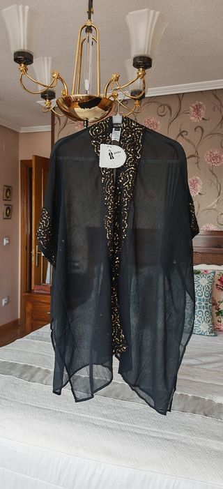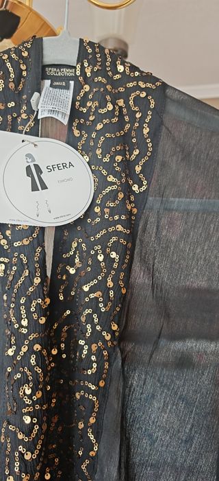 Precioso kaftán kimono de Sfera, perfecto para añadir un toque de brillo a tu look.Elegante kimono Kaftan negro trasparente,con lentejuelas doradas en las mangas y el delantero.Talla única.Nuevo con etiquetas.Sfera. - Diseño transparente en color negro. - Adornado con lentejuelas doradas en el cuello y mangas.