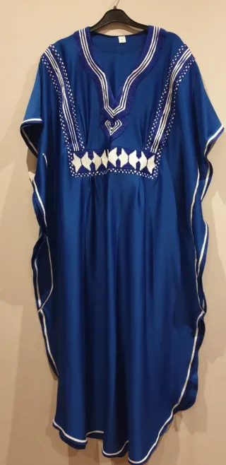 Kaftán de color azul marino con un diseño bordado en el cuello y el pecho. Es una prenda cómoda y con un estilo único. - Bordados blancos y azules. - Cuello en V. - Diseño geométrico en el pecho.