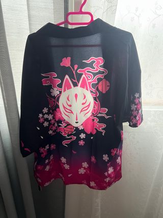 Prenda de estilo kimono con un diseño llamativo. - Estampado frontal de zorro y flores. - Degradado de color rosa en la parte inferior. - Mangas cortas con detalle de flores.
