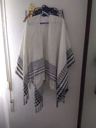 Chaqueta tipo poncho en color azul claro. Tiene flecos en las mangas y en el final de la camisa, con un bordado muy bonito. Es muy finito, una tela tipo gasa, muy agradable. Talla única, marca Red Queen. Está como nuevo.