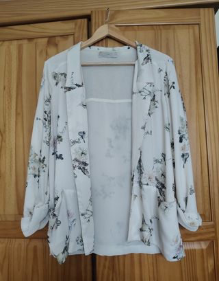 Blazer Tipo kimono fluida Zara, tela tipo seda, con precioso estampado de flores, no se arruga.