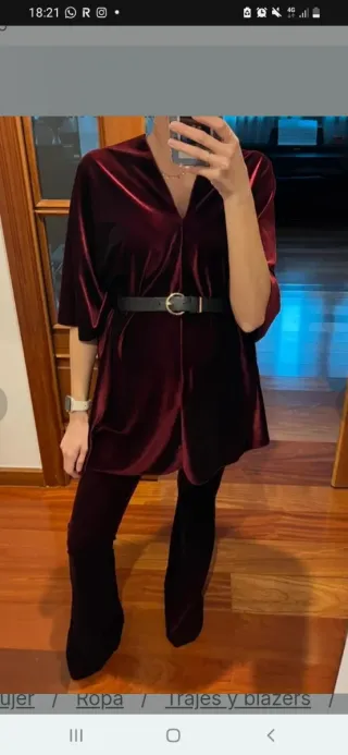 Conjunto de dos piezas de terciopelo. - Parte superior tipo kimono. - Pantalón de campana. - Cinturón negro con hebilla dorada.