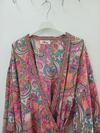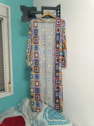 Precioso vestido estilo kimono. Es una prenda única y llamativa. Muy de verano. Se puede usar de vestido o con pantalón corto /largo. Un solo uso. - Diseño cruzado. - Manga 3/4. - Corte por encima de la rodilla. - Ideal para cualquier ocasión.