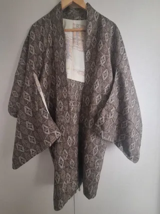 Kimono tradicional japonés con un diseño geométrico. Se ofrece kimono japonés vintage tipo komon (小紋), prenda tradicional japonesa de uso cotidiano con un clásico patrón geométrico repetitivo en tonos marrón tierra y beige (diseño de rombos y formas entrelazadas, estilo wagara estándar). Este ejemplar destaca por su elegancia discreta y atemporal, ideal para coleccionistas de kimonos, decoración de interiores, fotografía, eventos temáticos o como chaqueta/bata moderna con un toque oriental auténtico.