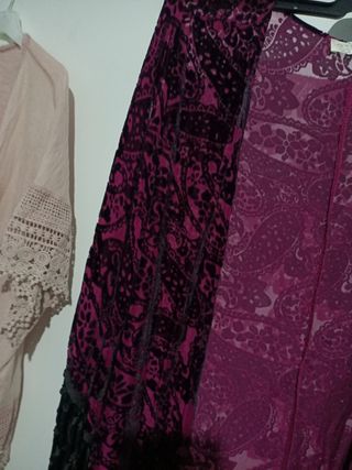 Preciosos kimonos con detalles de encaje. - Kimono rosa con mangas acampanadas y detalles de encaje. - Kimono morado con estampado floral y flecos.talla M ,4€ cada uno