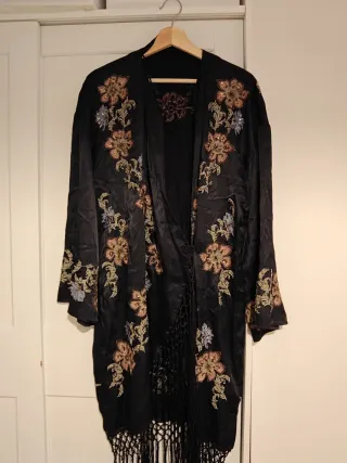 Vendo kimono largo Zara de edición limitada, modelo agotado en Zara. Precio original 170 €. Talla S/M (corte amplio). Tejido 100 % viscosa con bordados florales, lentejuelas y flecos largos. Cierre cruzado con botón interior y alamares. No es kimono básico: es pieza especial de colección, con mucha caída y presencia.envío. Todos los detalles están fotografiados. Sin estrenar pero sin etiquetas Entrega en mano o envío.