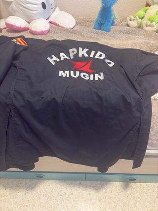 Kimono para la práctica de Hapkido. REGALO CINTURONES BLANCO Y AMARILLO. - Diseño con texto HAPKIDO MUGIN. - Detalle de bandera española en la manga. - Marca Daedo - Talla entre 12 y 16 años,( hasta 1’60 cm)