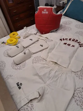 Conjunto de ropa de taekwondo para niño. - Peto protector Daedo. - Protecciones para brazos y espinillas. - Cinturón amarillo. - Kimono de taekwondo con pantalón y chaqueta.