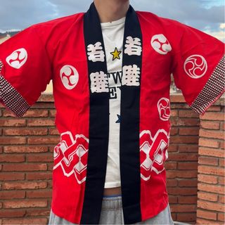 Kimono tradicional japonés con un diseño llamativo. Talla para niño, no más de 12 años. - Estampado de símbolos blancos sobre fondo rojo. - Mangas cortas y corte abierto. - Ribete negro en el cuello y la parte frontal.