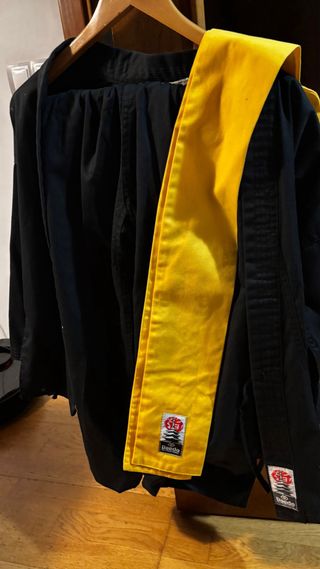 Kimono de artes marciales Budo en color negro, incluye faixa amarilla. - Tejido resistente. - Diseño clásico. - Talla 140 cm (niño) - muy buen estado