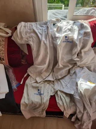 Se venden dos kimonos de karate blancos, uno para niño de 7/8 años y otro talla M. 10 cada uno y 15 los 2 - Kimono para niño de 7/8 años. - Kimono talla M. - Marca: Wear Warrior.