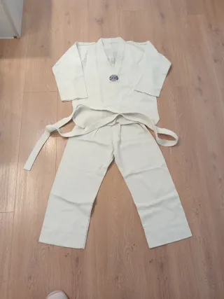 Conjunto de kimono y cinturón. - Kimono de color blanco. - Cinturón de color blanco. Es de niño es de 7-8 años (130cm) esta utilizado solo una vez en la clase de prueba y no se a vuelto a utilizar