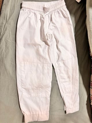 Pantalón de kimono de judo para niño. No recuerdo talla exacta, en las fotos aparece medidas, el pantalón tiene dobladillo por si se quiere alargar. Era de manga larga, pero se cortaron por comodidad. - Cintura elástica con cordón. - Refuerzos en las rodillas. - Dobladillo en los bajos.