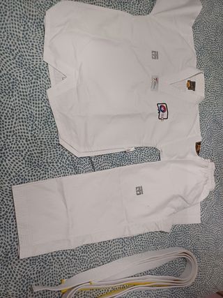 Kimono Taekwondo del gimnasio lee en perfecto estado, puesto 4 veces contadas, letras, color, sin costuras posteriores a la compra, nuevo prácticamente, con cinturones blanco y blanco-naranja, fue comprado para niña de 10 años (por el tamaño). Aun brilla.
