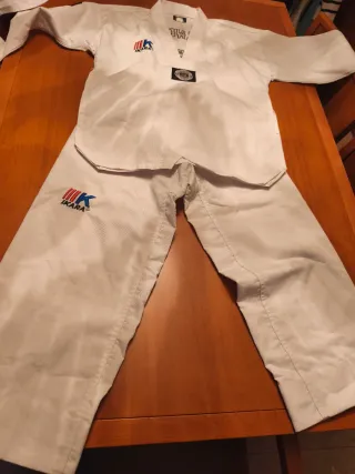 Kimono de taekwondo en perfecto estado, casi nuevo. - Chaqueta con cuello y cierre cruzado. - Pantalón con cintura elástica y cordón. - Tejido resistente y transpirable.