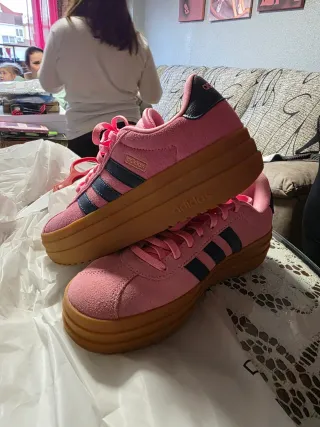 Zapatillas de plataforma Adidas en color rosa con detalles en azul marino. - Diseño de ante. - Suela de goma gruesa. - Cordones rosas. - Tres rayas icónicas de Adidas.