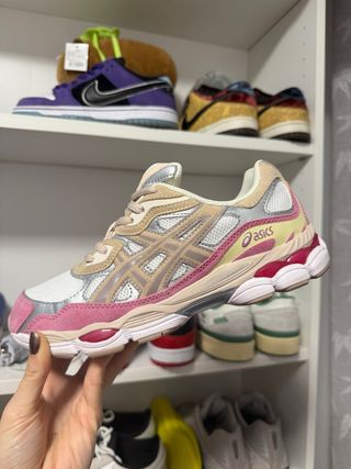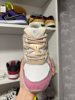 Zapatillas Asics NYC blancas con detalles rosas. Talla 40, muy poco uso. Sin la caja original, con la etiqueta suelta y factura de la compra.