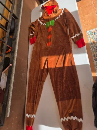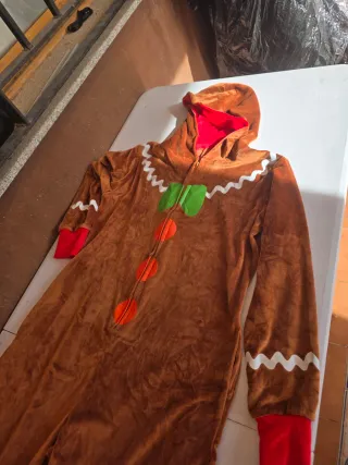 Divertido pijama con diseño de hombre de jengibre. Ideal para fiestas o para estar cómodo en casa. - Diseño de hombre de jengibre. - Cierre de cremallera frontal. - Capucha integrada. - Puños y cuello con detalles blancos. - Forro interior rojo.