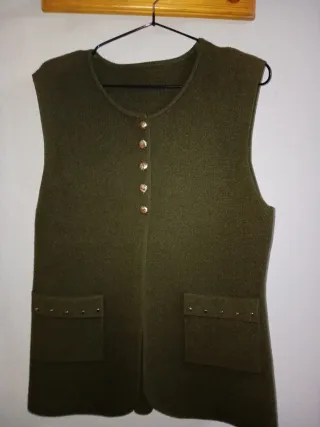 Chaleco de punto de color verde, con un diseño clásico y elegante. - Cuello redondo. - Cierre de botones dorados. - Dos bolsillos delanteros con detalle de tachuelas.