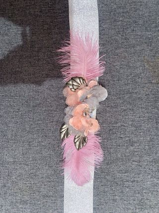 Elegante cinturón decorado con flores y plumas, perfecto para complementar un vestido. - Adornado con detalles florales en tonos rosa y gris. - Incorpora plumas suaves en color rosa. - Elementos plateados que añaden un toque de brillo.