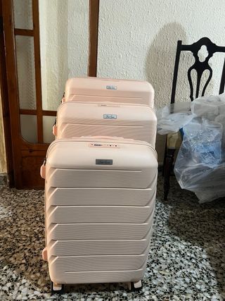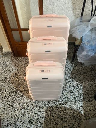 Conjunto de tres maletas de viaje en color rosa, perfectas para organizar tu equipaje. - Maleta grande - Maleta mediana - Maleta pequeña - Diseño moderno y resistente - Cerradura de combinación integrada