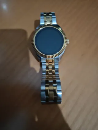 Reloj inteligente con un diseño moderno y elegante. - Correa de color beige. - Bisel y detalles en color dorado.