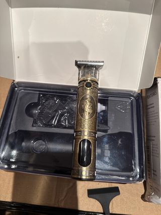Máquina de corte de pelo y afeitadora con un diseño vintage y detalles ornamentados. Ideal para un acabado profesional. - Cuerpo metálico con acabado dorado y negro. - Cuchillas de precisión. - Incluye accesorios de corte.