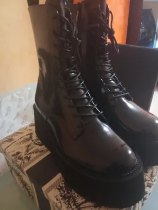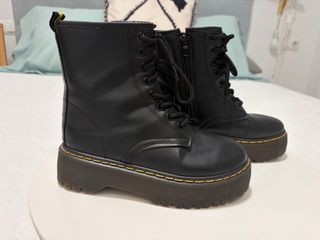 Botas de estilo militar con plataforma. - Cierre con cordones y cremallera lateral. - Detalle de tira en la parte trasera. - Suela gruesa con relieve.