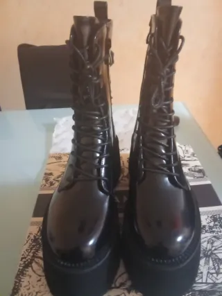 Botas de estilo moderno con cordones y una plataforma gruesa. - Diseño de caña alta. - Acabado brillante. - Cierre de cordones.