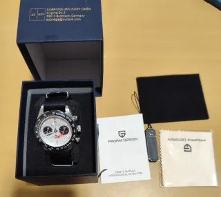 Reloj analógico Pagani Design con detalles en plata y negro. Incluye caja original, manual de usuario y garantía internacional. - Caja de acero inoxidable. - Correa de tela negra. - Bisel con taquímetro. La caja está un poquito estropeada.
