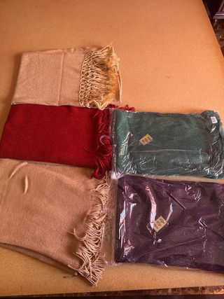 Conjunto de chales de lana con un diseño elegante y flecos. - Chal en color rojo. - Chal en color beige con flecos. - Chal en color beige claro con flecos. - Chal en color morado brillante. - Chal en color verde brillante.