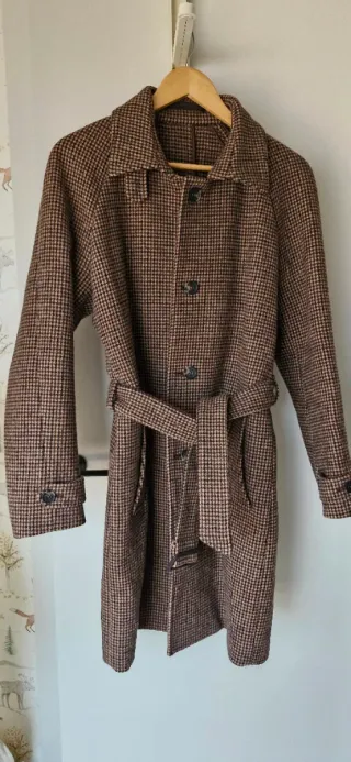 Elegante abrigo con estampado de pata de gallo. - Diseño clásico y atemporal. - Cinturón para ajustar. - Cuello solapa. - boton en cuello para ajuste. - bolsillos inferiores.