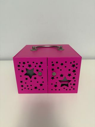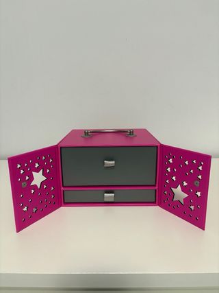Este joyero de color fucsia presenta un diseño encantador con estrellas. - Decorado con un patrón de estrellas y puntos. - Incluye un asa para facilitar su transporte. - Cuenta con dos puertas frontales y dos cajones
