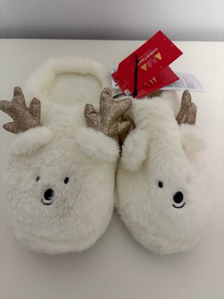 Adorables pantuflas navideñas con diseño de reno. Perfectas para mantener los pies calientes durante la temporada festiva. - Suaves y acogedoras. - Detalles de cuernos dorados. - Cara de reno bordada.