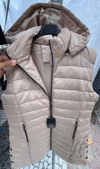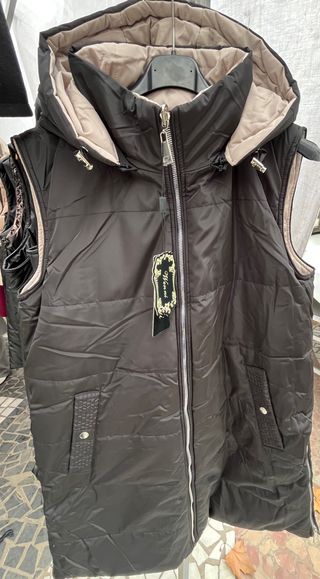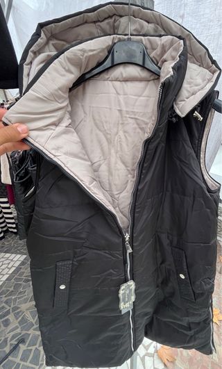 Chaleco acolchado largo con capucha, perfecto para añadir una capa extra de abrigo. Su diseño moderno y funcional lo hace ideal para el día a día. - Cierre frontal con cremallera. - Bolsillos laterales con cremallera. - Capucha integrada para mayor protección y con cremallera también. - Detalle de botones en los laterales.