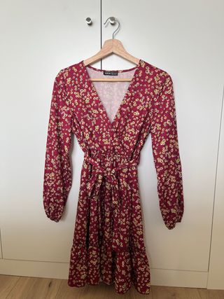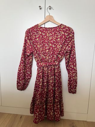 Vestido con estampado floral en tonos rojos y amarillos. - Manga larga. - Cinturón para ajustar. - Bajo con volantes.